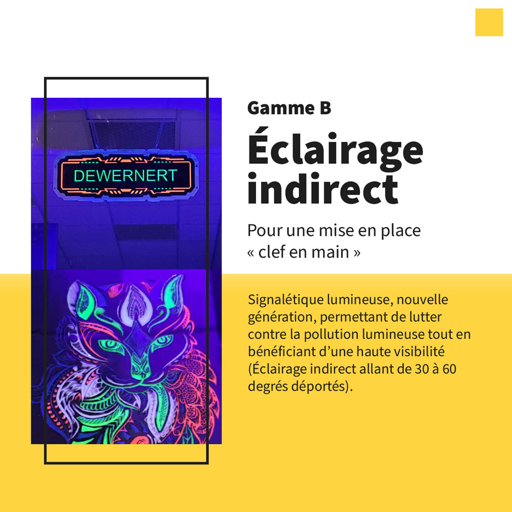 Nous sommes heureux de lancer la première signalétique composée a 98,4%* de produits biologiques à très basse consommation, issue de deux années de développement en interne dans notre atelier situé à Strasbourg en France, il s’agit principalement d’une matrice qui emprisonne dans un bain de résine biologique un certain pourcentage de macro particules réagissant à une fréquence lumineuse comprise dans le spectre de la lumière ultraviolet et de macro particules photoémettrices, qui nous permets de réaliser cette exploit en terme de rapport consommation et de restitution de luminosité.