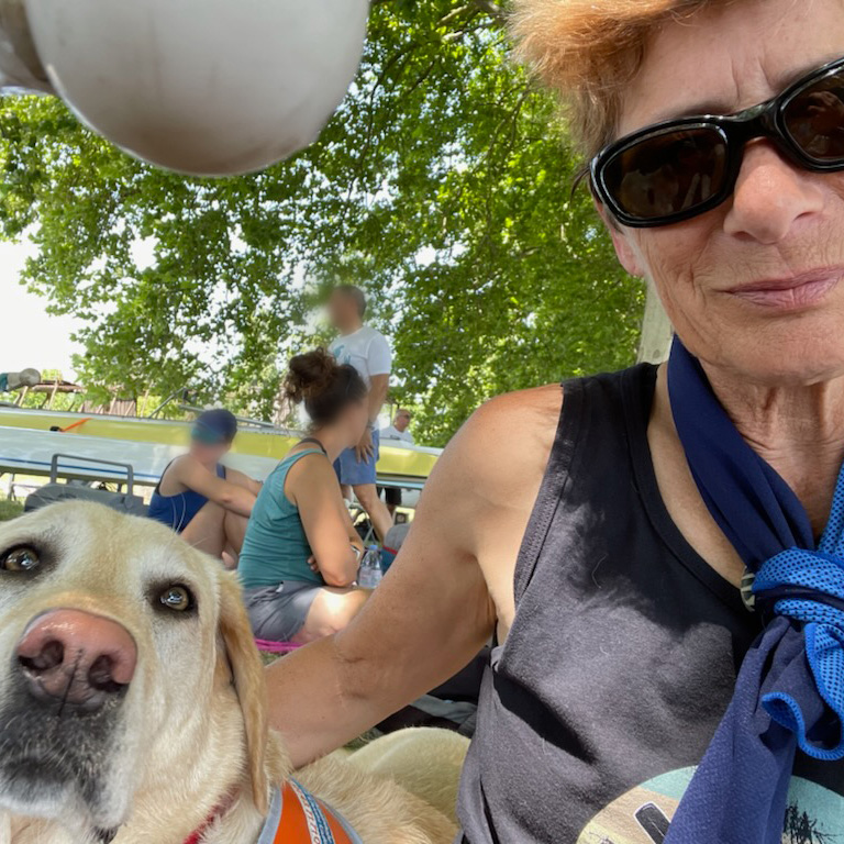 Nouka (la chienne guide pour malvoyants formée par le Centre de Woippy) qui l’accompagne dans tous ses déplacements nous a également fait forte impression par sa gentillesse et sa rigueur en période de travail : voilà typiquement un attelage que nous avons un énorme plaisir à encourager !